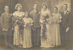 Best man, Robert Redvers George Fleming ( my grandfather) on the left. Bridesmaid, Joan Fleming (my mother), centre left.